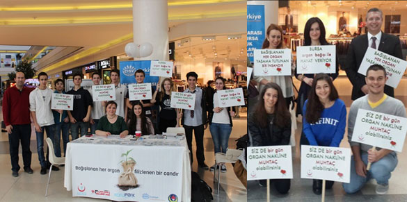 İl Sağlık Müdürlüğü tarafından bir alışveriş merkezinde düzenlenen ve vatandaşları organ bağışı hakkında bilgilendirme ve gönüllülerden organ bağışı toplama çalışmalarına öğrencilerimiz broşür dağıtarak ve gönüllüleri standa yönlendirerek yardımcı oldular.