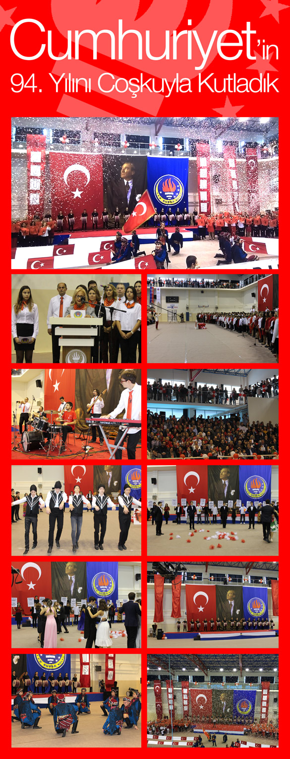 Törende açılış konuşmasını yapan İlköğretim Kurumları Müdürü Türkan DİNGAZ Cumhuriyet’in kuruluşunun 94. yılında, toplumsal barışın ve kardeşlik duygularının her zaman ve her koşulda önde tutulması, ulusumuzun yeteneklerine, birikimine ve yaratıcı gücüne inanılmasının ortak amaç olması gerektiğini belirtti. Türkan DİNGAZ konuşmasının sonunda Atatürk’ün devrim ve ilkelerine Cumhuriyetimizin temel ve vazgeçilmez değerlerine inanan tüm öğrenci, öğretmen ve velilere katılımlarından dolayı teşekkür etti. Konuşmanın ardından, İlköğretim öğrencilerinin ve velilerinin seslendirdiği marşlar, tüm katılımcılar tarafından büyük bir beğeniyle izlendi. Cumhuriyet’in kuruluşu öncesinde, Atatürk’ün düşüncelerini silah arkadaşlarıyla paylaşması ve o zorlu dönemleri betimlemesi üzerine Lise Öğrencileri tarafından gerçekleştirilen “Cumhuriyetten Bugüne Memleketim” konulu drama gösterisi ve ardından gerçekleştirilen asma davul ritim çalışması seyredenler tarafından büyük alkış aldı. Lise öğrencilerinin folklor gösterisiyle devam törenin sonunda, tüm öğrenciler ve veliler sahnede, İzmir Marşını coşkuyla söyleyerek, salondaki tüm katılımcılarla birlikte Cumhuriyet’in 94. Yılını kutladılar.
