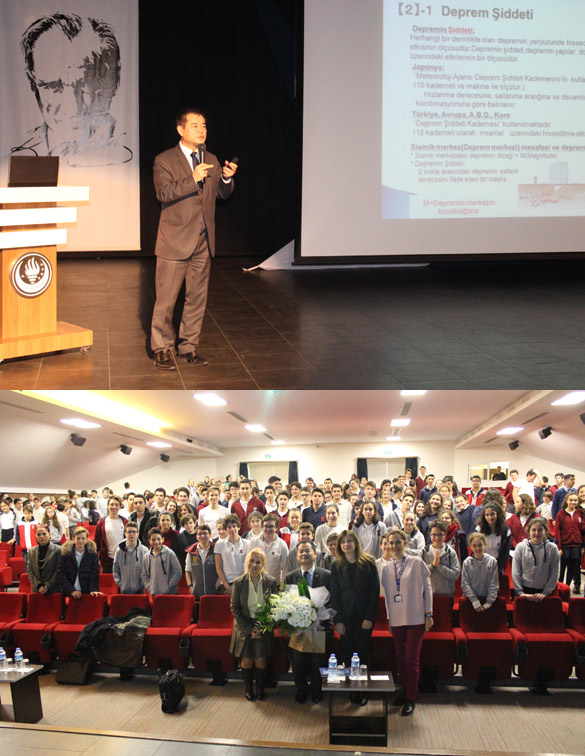 Okulumuz ortaokul ve lise öğrencilerine 20.12.2017 Çarşamba günü Türkiye’nin deprem kuşağındaki yeri, deprem öncesinde ve sırasında yapılması gerekenlerin önemini içeren bir sunum yapıldı. Bu konuda uzman konuğumuz Yüksek Mimar ve İnşaat mühendisi Sayın Yoshinori Moriwaki, 27 yıllık Türkiye yaşamında öğrendiği güzel Türkçesi ile öğrencilerimize bilgi aktarımda bulundu. İnteraktif bir şekilde yapılan sunumda öğrencilerimiz deprem gerçeğine ilişkin merak ettikleri ayrıntıları da öğrenme fırsatı buldu.