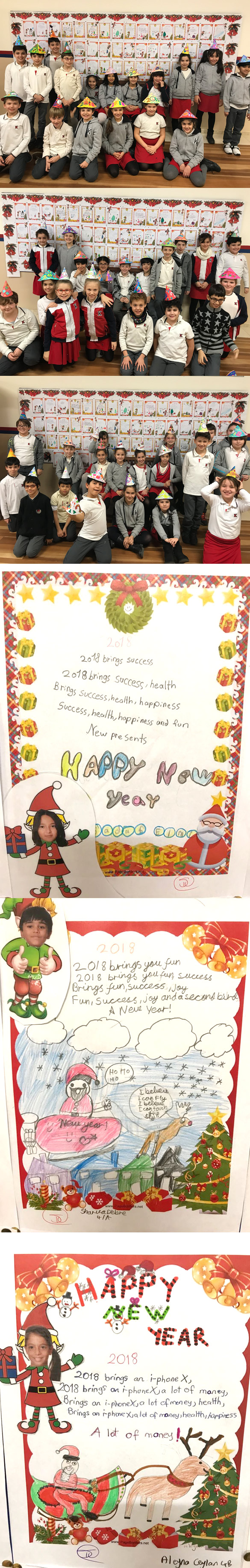 4. sınıf öğrencilerimiz, yeni yıldan beklentilerini anlatan İngilizce şiirlerini yazdılar. Öğrencilerimiz, şiirleriyle beklentilerini dile getirdikten sonra yılbaşı şapkalarını hazırladılar.