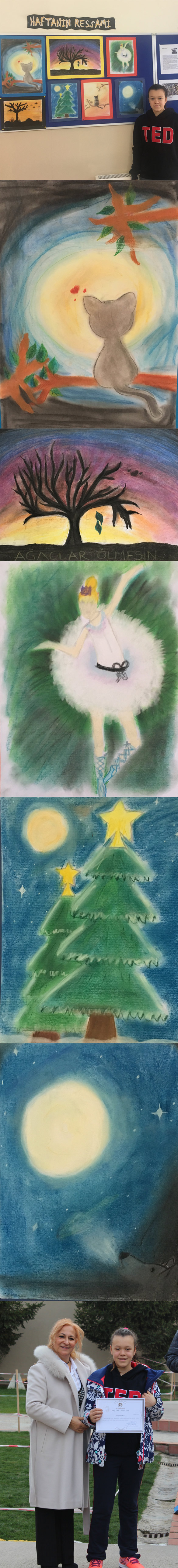 HAFTANIN SERGİSİNDE Nehir KOÇ Okulumuz ortaokul öğrencilerinin sanat çalışmalarında onları yüreklendirmek ve bireysel emeklerini herkesle paylaşmak amacıyla geleneksel hale getirdiğimiz haftanın ressamı köşesinde açılan sergimizin bu haftanın konuğu da Nehir KOÇ oldu. Resim Öğretmenimiz Nevin GÜLTEKİN rehberliğinde, eğitim yılının ilk gününden itibaren ders dışı yürütülen çalışmalar onların özverisi ile oluşturuldu. 7. sınıfta öğrenim gören öğrencimiz yalnızca akademik değil sanatsal çalışmalarla da eğitimin bir bütün olduğunu göstermeye devam ediyor.Sergisinde teknik olarak toz pastel kullanmıştır. Nehir KOÇ’un beğeni alan çalışmaları adına öğretmenleri ve okul yönetimi tarafından tebrik edildi.