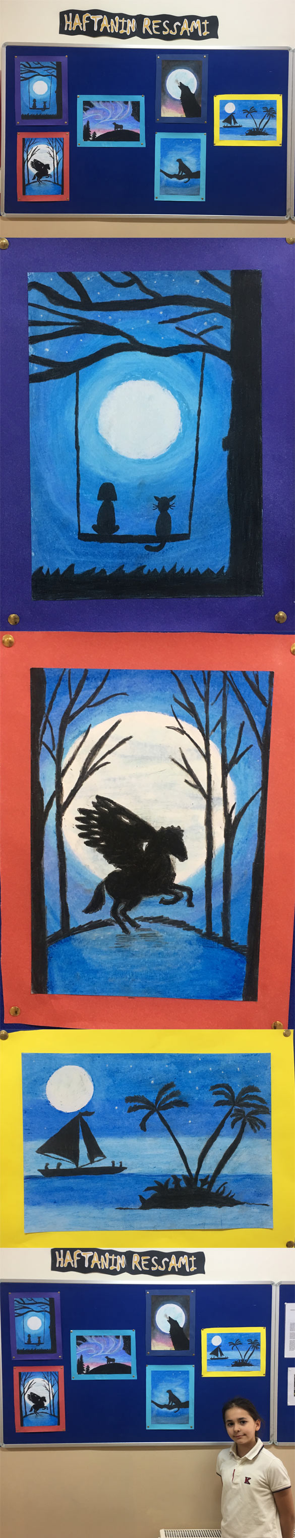 Okulumuz ortaokul öğrencilerinin sanat çalışmalarında onları yüreklendirmek ve bireysel emeklerini herkesle paylaşmak amacıyla geleneksel hale getirdiğimiz haftanın ressamı köşesinde açılan sergimizin bu haftaki konuğukları Şevval Deniz TAŞ oldu. Çalışmalarında teknik olarak kuruboya kullanmıştır. Tema olarak da en seviği yiycekleri bir araya getirmiştir. Resim Öğretmenimiz Nevin GÜLTEKİN rehberliğinde, eğitim yılının ilk gününden itibaren, ders dışında yürütülen bu çalışmalar öğrencilerimizin sanatla iç içe olmalarını sağlamaktadır. Şevval Deniz TAŞ , beğeni alan çalışmaları adına öğretmenleri ve okul yönetimi tarafından tebrik edilmiştir.