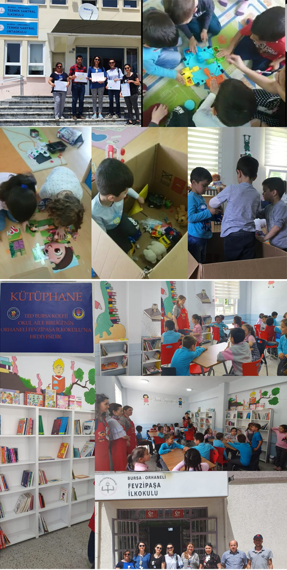 TED Bursa Koleji Okul Aile Birliği, Orhaneli ilçesinde bulunan dört okulu ziyaret etti. Anaokulu öğrencilerimizin akranlarıyla paylaşmak üzere hazırladığı oyuncak ve eğitsel gereçlerden oluşan koliler, Fevzipaşa, Termik Santral, Şehit Jandarma Er Ayvaz Gür ve Karınca İlköğretim Okullarının ana sınıflarına teslim edildi. 2017-2018 Eğitim Öğretim yılında Jandarma Er Ayvaz Gür İlkokuluna taşımalı sistemle gelen küçüklerin bekleme odasını tefriş ederek “Akıl Oyunları Odası” nı oluşturmuş olan OAB üyeleri, yaptıkları yeni ziyaretle odanın kullanımını görmekten duydukları memnuniyeti dile getirdiler. Bu yıl da Fevzipaşa İlkokulunda kütüphane oluşturulmasına katkı veren OAB üyeleri, götürdükleri kitapları öğrencilerle birlikte yerleştirdiler ve birlikte oyunlar oynayarak paylaşımlarda bulundular.