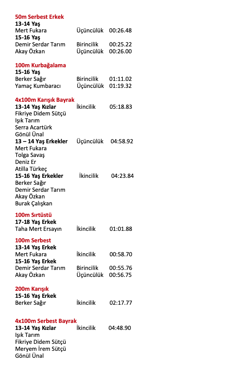 25 Eylül 2021 tarihinde Atıcılar Olimpik Yüzme Havuzunda yapılan “Avrupa Spor Haftası Yüzme Müsabakaları”nda kulübümüz sporcularının almış oldukları dereceler şu şekildedir: