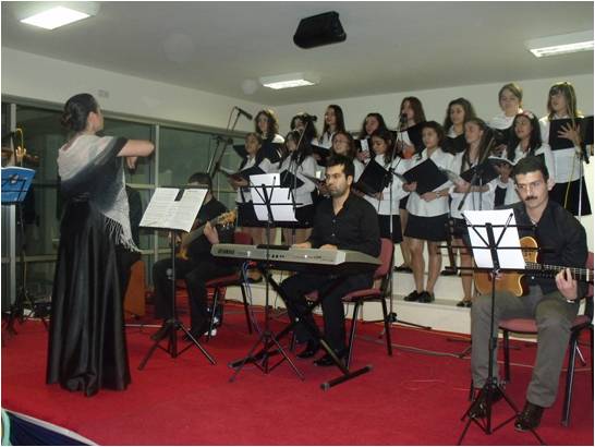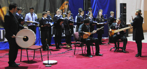 Okul korosu, 5. sınıf öğrencilerinin sahnelediği oratoryonun şarkı ve marşlarını seslendirmiştirır.