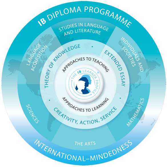 IB Diploma Programı müfredat çerçevesi ana konuların etrafındaki altı bilgi alanını göstermektedir. IB Diploma öğrencilerinin her gruptan bir ders almaları gerekmektedir. Altı dersin en az üçü ileri Düzey (HL) ve diğer üç dersi ise standart düzeyden (SL) olmalıdır. Buna ek olarak, öğrenciler Bilgi Kuramı dersi (TOK) alırlar, Bitirme Tezlerini teslim ederler ve CAS (Yaratıcılık, Hareket ve Toplum Hizmeti) çalışmalarında yer alırlar.
