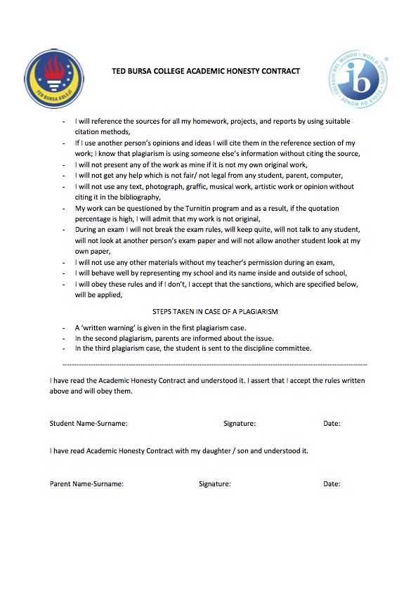From the day of its foundation, TED Bursa College aims to raise individuals who are aware of their values, respect for others, responsible individuals and can objectively question things with scientific methods, are able to find new topics to search about when they do research and contribute to overall development of oneself. We, as a school, expect our students to be aware of the notion of academic honesty and show appropriate academic behavior throughout their lifetime.